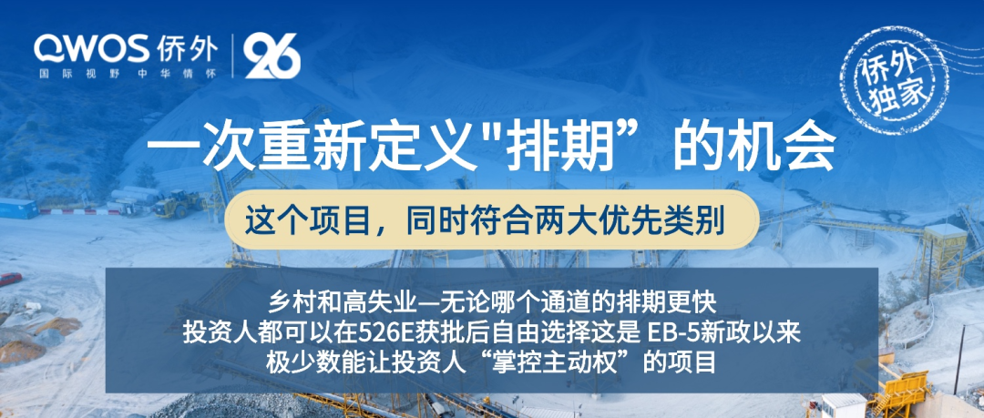 单一项目同时满足“乡村地区”与“高失业地区”两类签证预留标准,I-526E获批后可根据排期进展自主选择更优赛道,始终把握主动。